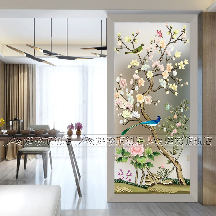 Art glass modern new Chinese entryway screen partition background wall living room sliding door frosted transparent magnolia magpie