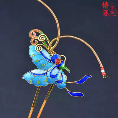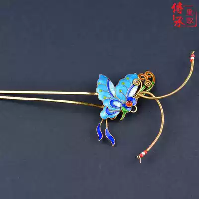 (Butterfly tentacles tremble)Ancient headdress Hanfu accessories Headdress Hair accessories burned blue handmade butterfly silver hairpin
