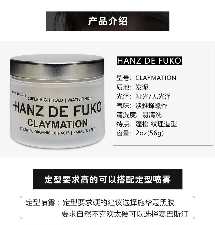 American Hanz De Fuko CLAYMATION High-strength semi-matte organic ingredients hair clay Hair wax