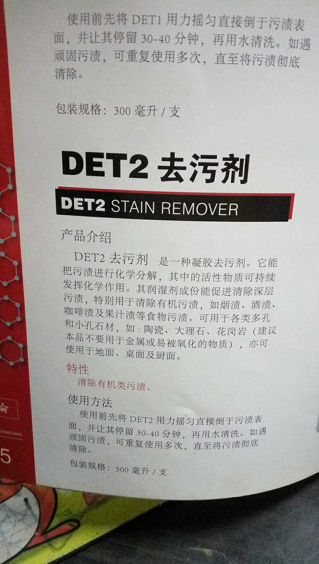 DET2 removes food stains such as tobacco stains, wine stains, coffee stains, juice stains, etc. Suitable for marble, granite and ceramics