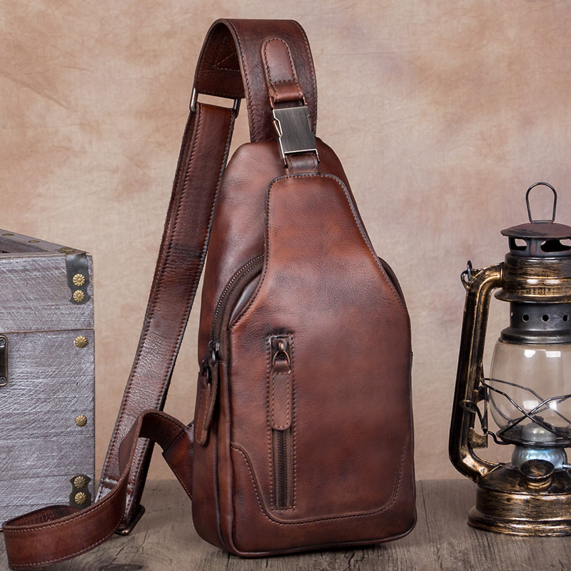 Men's bag Skew Satchel handmade leather bag Male head layer Bull Leather Retro Chest Bag Men Genuine Leather Soft Leather Large Capacity Casual