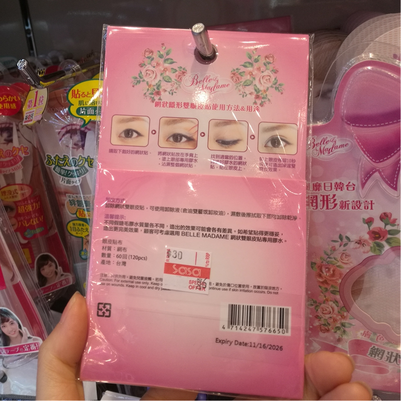 2 pieces of BELLE MADAME Lace Double Eyelid Stickers made in Taiwan 60 pairs without glue sold by sasa in Hong Kong