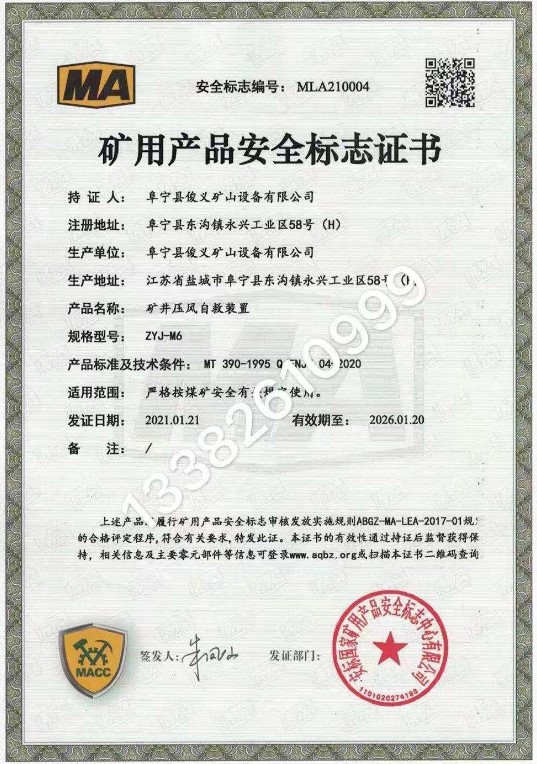 ZYJ-M6 mine pressure wind rescue device coal safety certificate complete