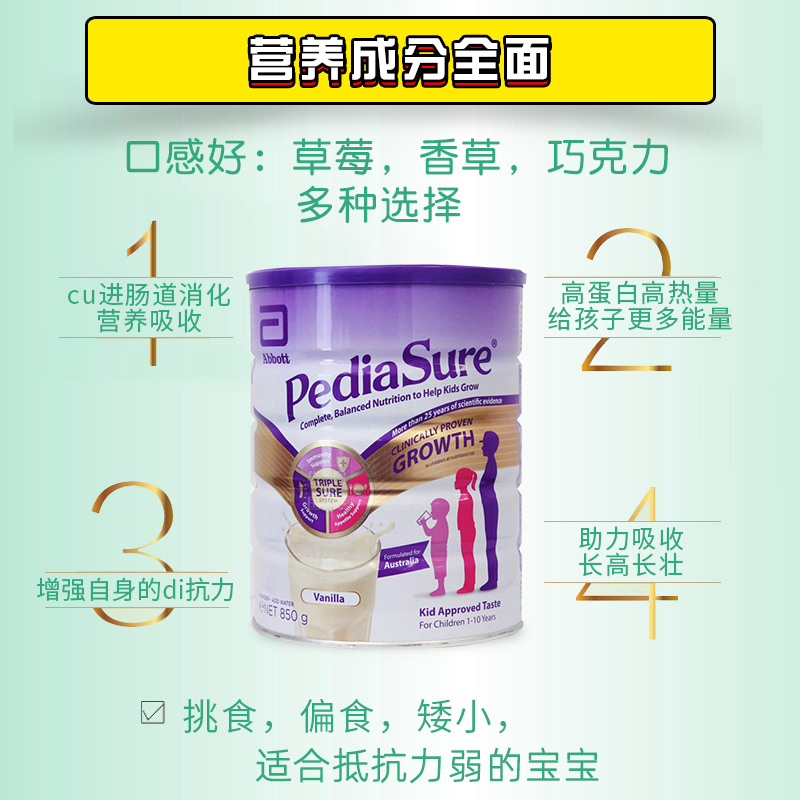 Australian PediaSure Abbott small Angan child nutrition milk powder 1-10 years old high 850g vanilla strawberry flavor