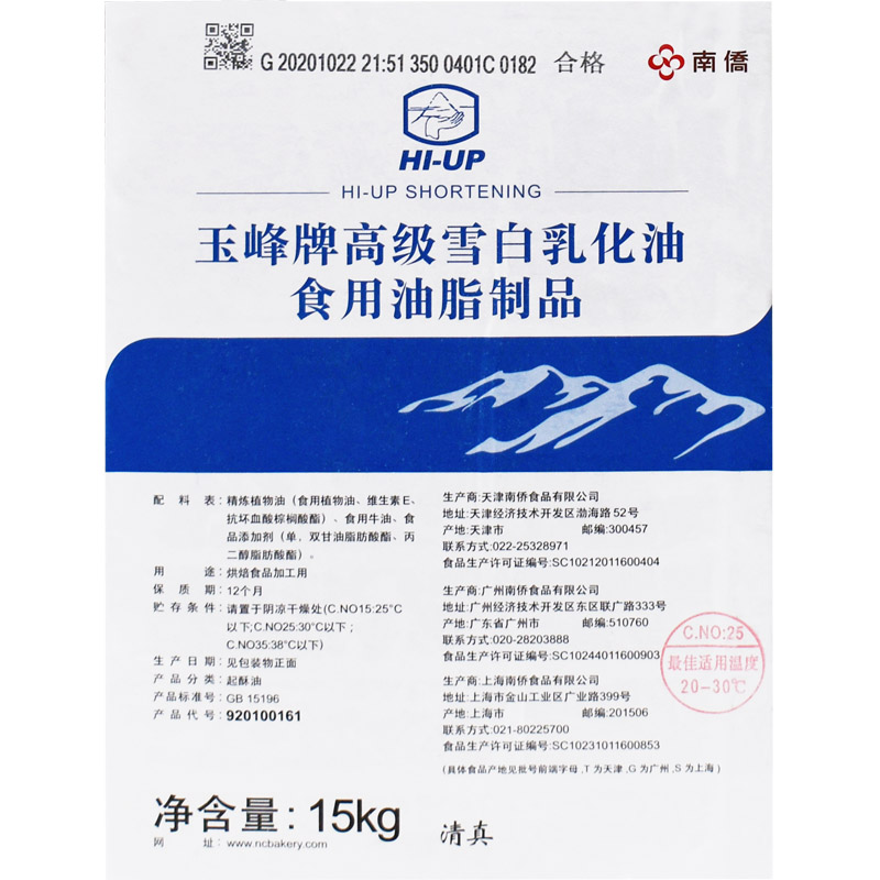 Nanqiao Yufeng brand high-grade snow white emulsified oil white oil shortening 15kg barrel Nanqiao ghee