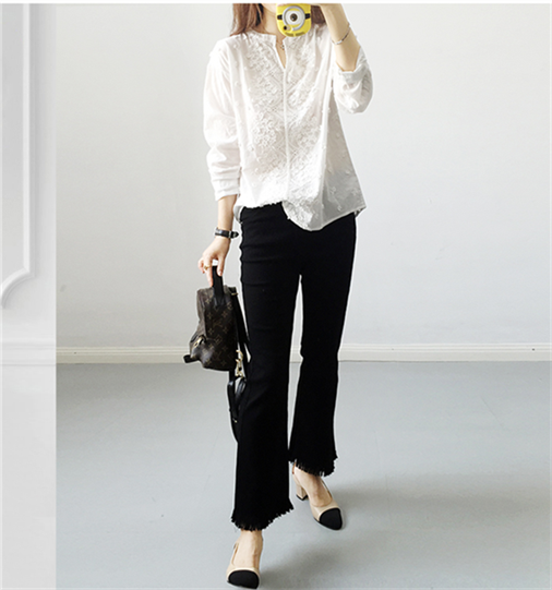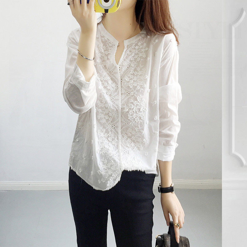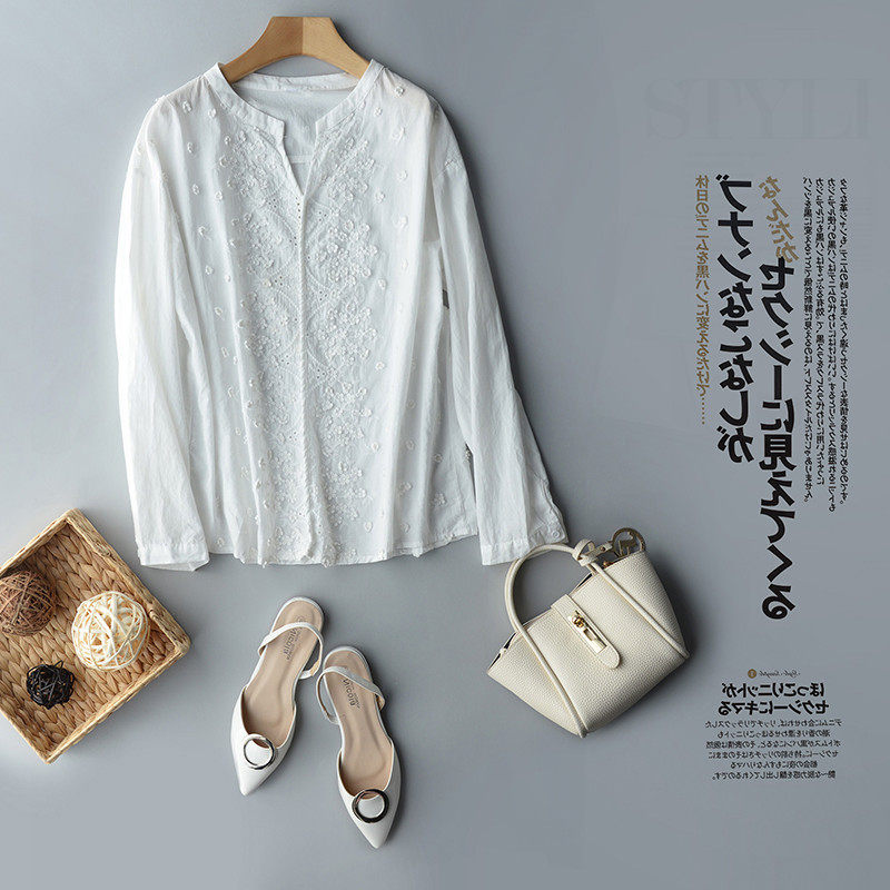 White shirt woman cotton Han edition fresh old embroidery style sweet 2022 new V - collar long sleeve shirt woman