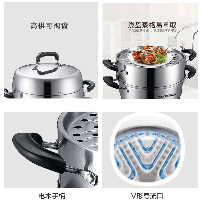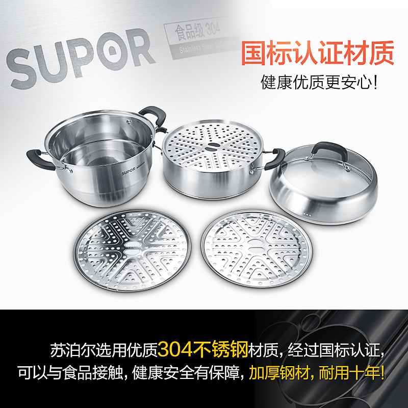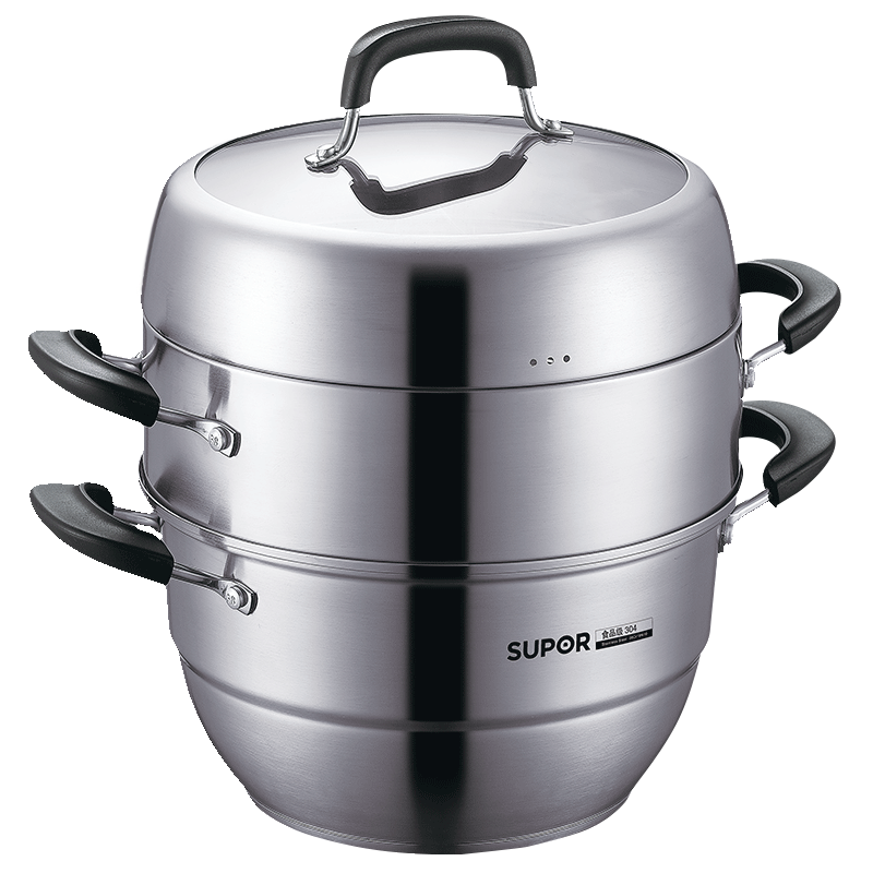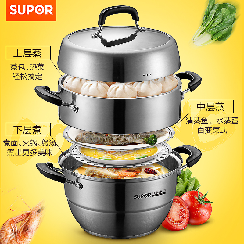 Supoir steamer 30cm large capacity 3 layers Home 304 stainless steel pan thickened rebase gas induction cooktop
