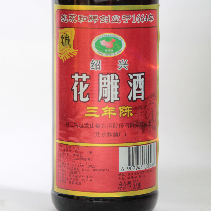 Shaoxing Shen Yonghe flower sculpture wine three years Chen 600 ml 15 degree yellow wine cooking ancient Vietnam Mountain