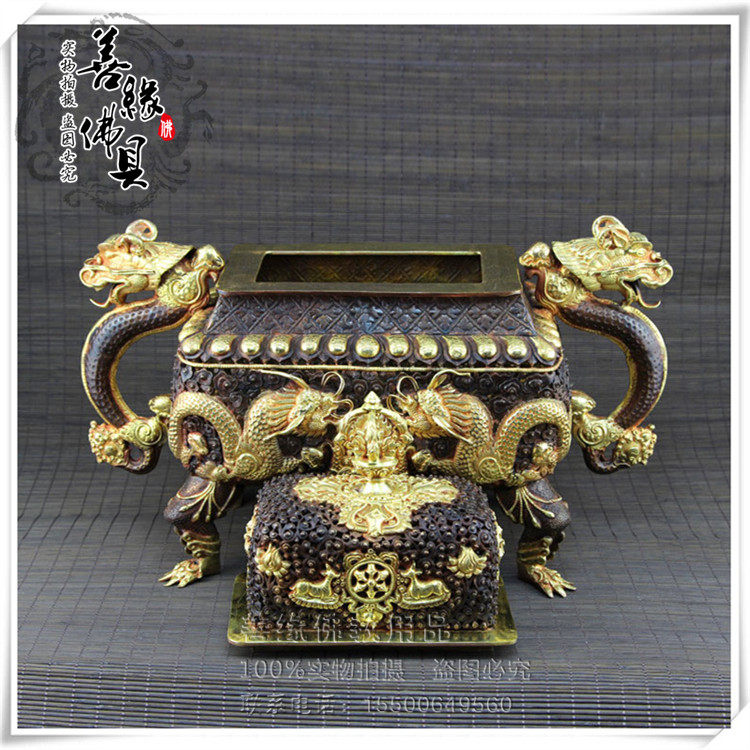 Imported Nepalese pure handmade red copper full-time gold hollowed-out double-dragon high-end burning incense stove Long 43cm Long 43cm