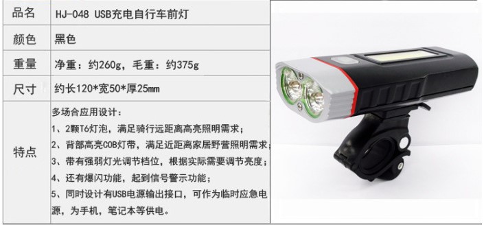 HJ-048 bike front light 2 * T6 light Pearl 500LM flashlight USB charging bike front light work light-Taobao