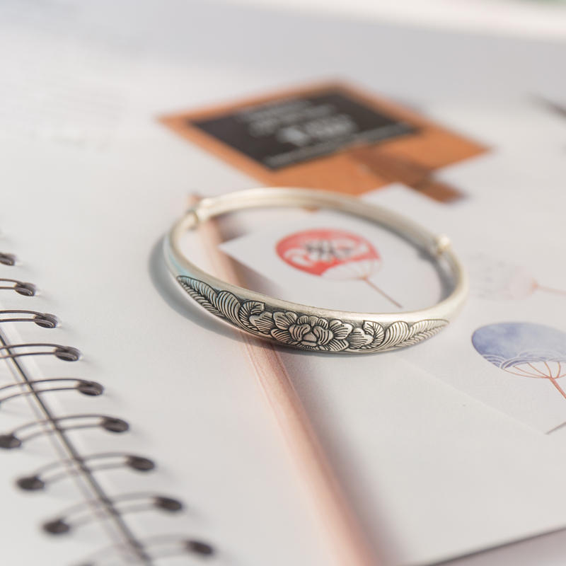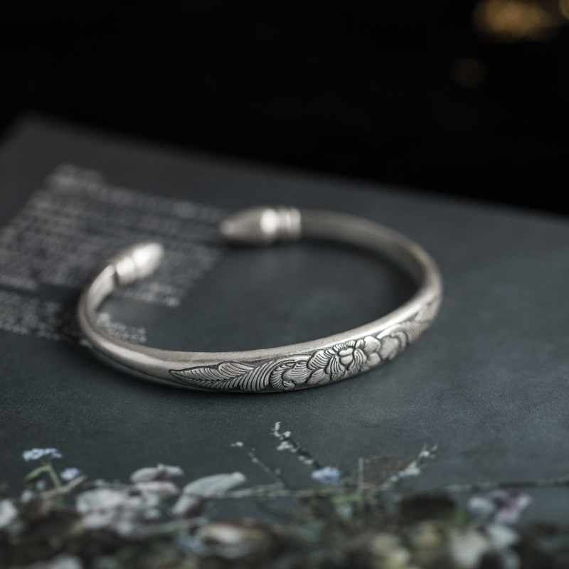 (Dream Pickup Light) Waiting for you to come 999 pure silver sterling silver peony flower retro engraving bracelet adjustable pull