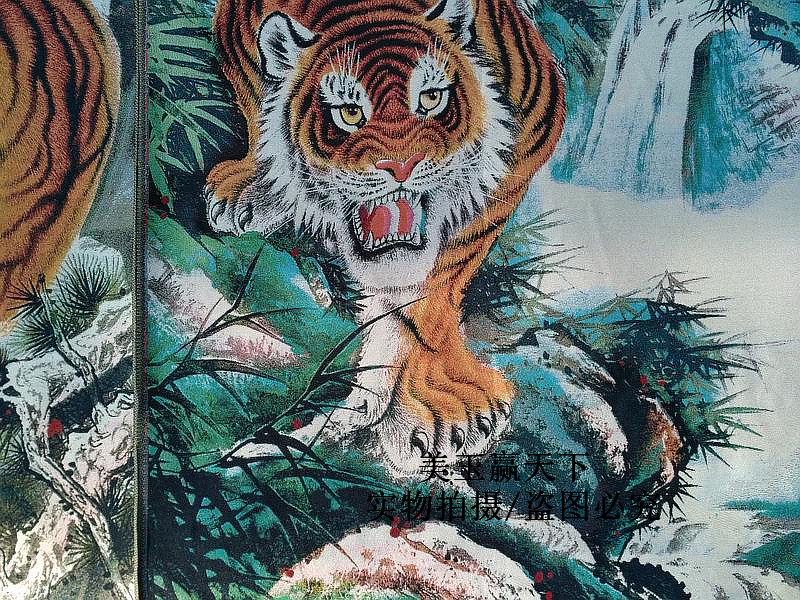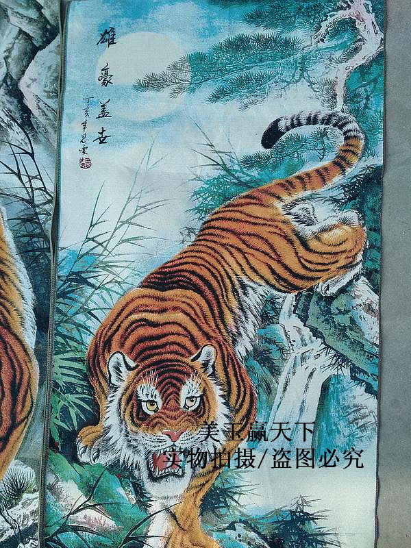 Machine embroidered silk golden silk embroidery embroidered silk brocade characters walking beast painting Mountain tiger down mountain tiger weasel brocade hang painting