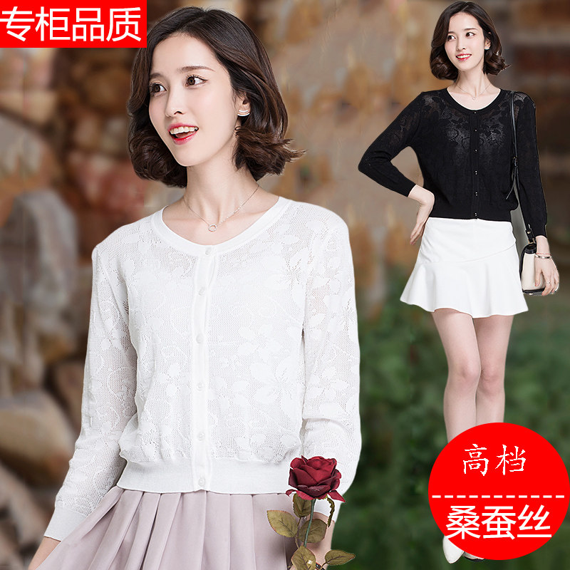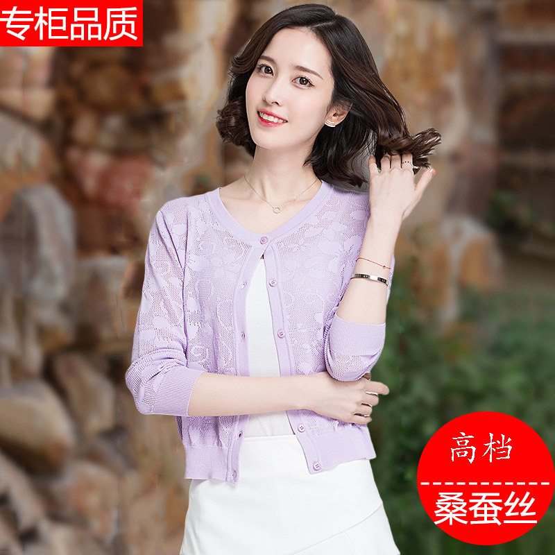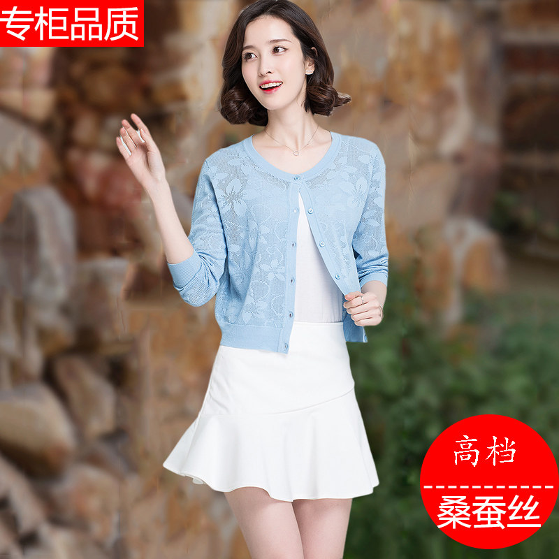 Dynamic Ice Silk High Waist Green Cardigan Thin Women's Hollow Air-conditioning Shirt Mulberry Silk Sunscreen Small Jacket with Skirt