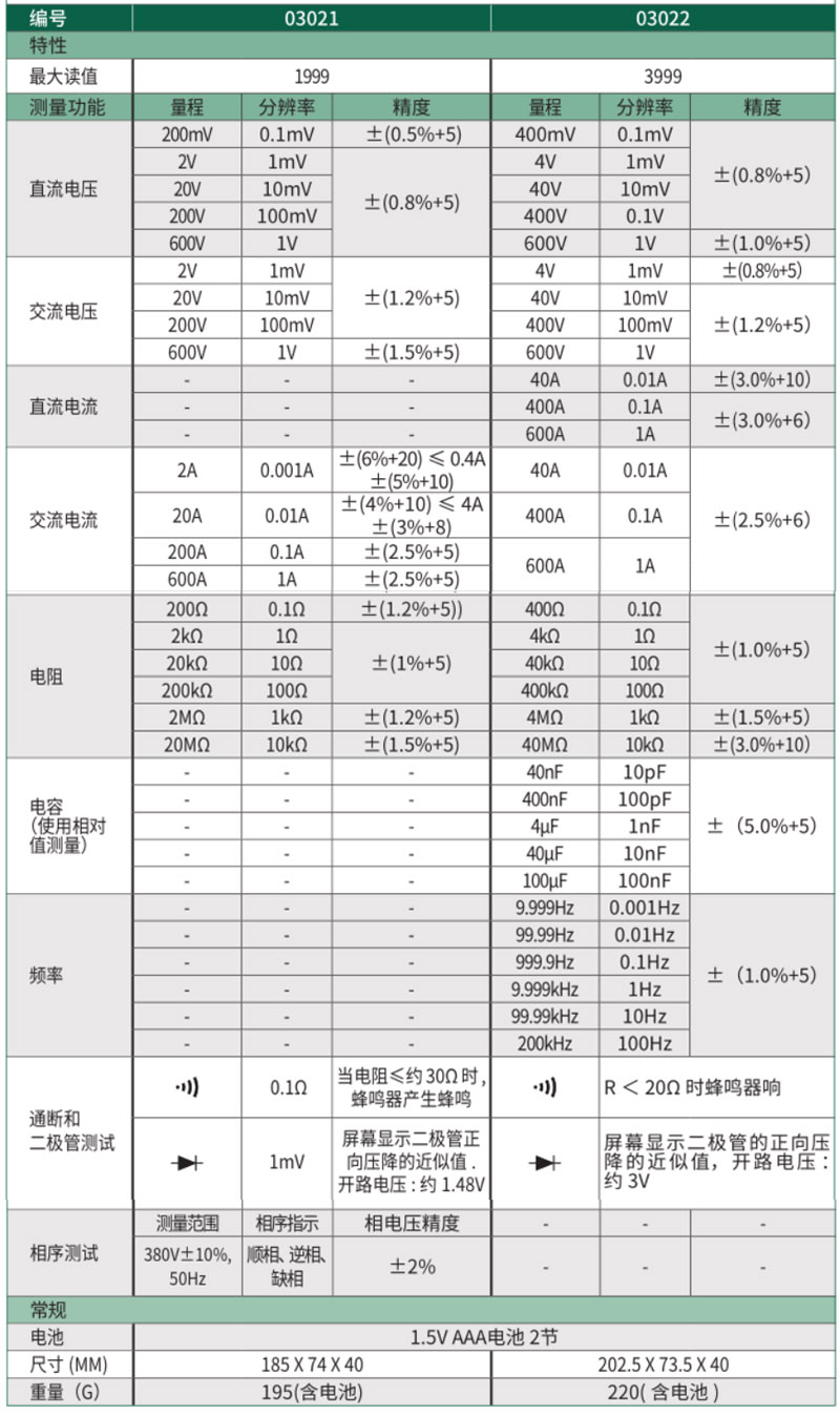 03021 Max 1999 AC / DC Voltage AC / DC Current resistance On / off phase sequence diode 03022 Max 3999 AC / DC voltage AC / DC current resistance capacitor