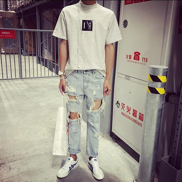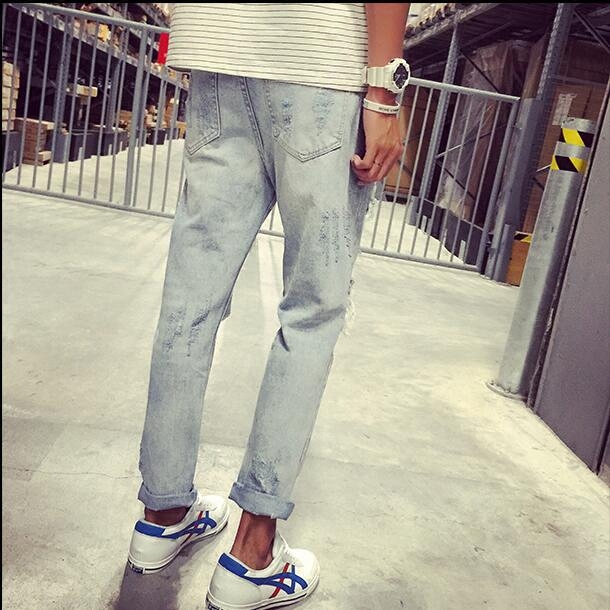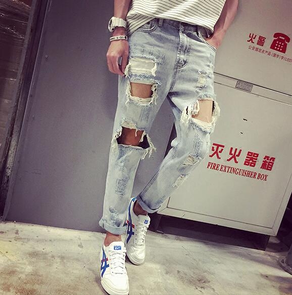 Spring and summer new Chaobou lovers Han version of body washed up with knee big broken hole jeans Men's crack and beggar pants male wave