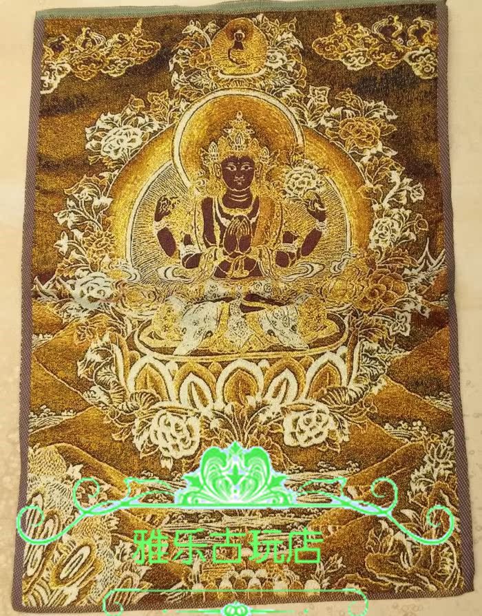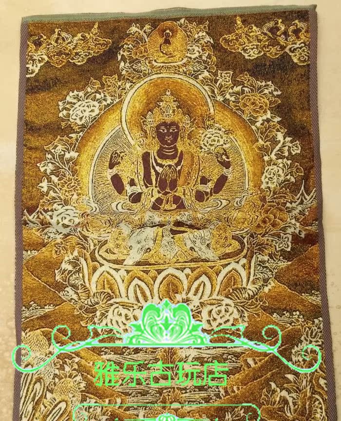 Tibetan religion Nepal golden silk Thangka portrait Brocade machine embroidered cloth painting Silk trumpet four-armed Guanyin Thangka