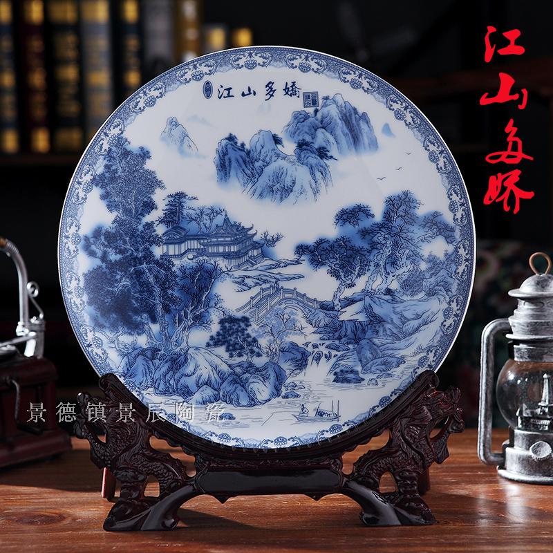 Jingdezhen ceramics pastel blue and white landscape painting decorative porcelain plate hanging plate modern home decoration living room decoration