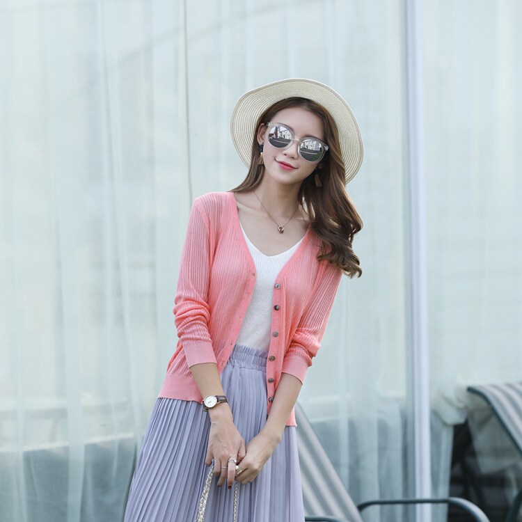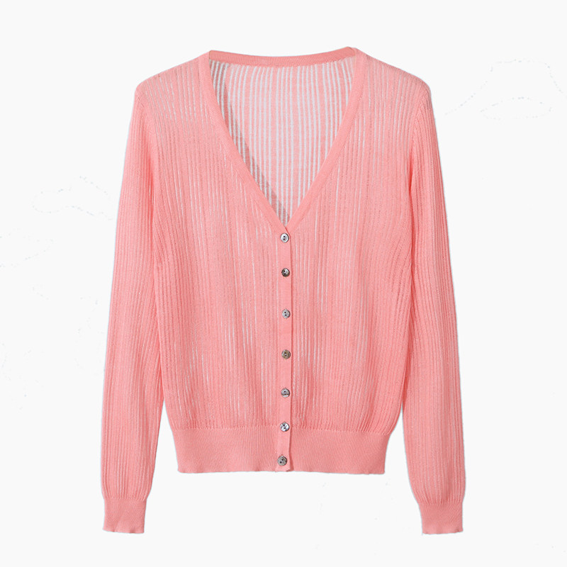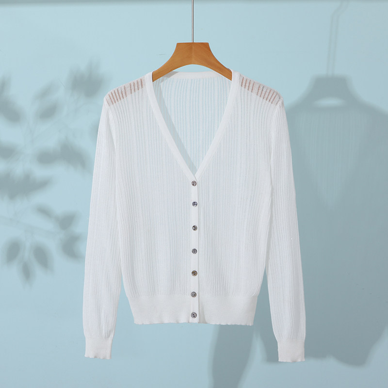 Summer ultra-thin knitted women's cardigan solid color shawl short striped hollow small jacket long-sleeved air-conditioning sun protection clothing