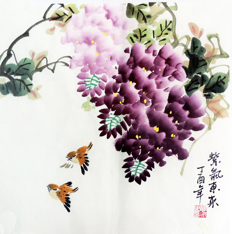 Special Promotional Handpicture Painting of Ink Flowers and Birds Painting Room Portrait Little Picture Picture of Purple Vine Bird