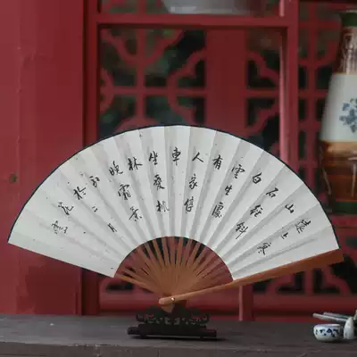 Folding fan 8 inch hand-painted rice paper ancient fan Chinese style high-grade jade bamboo gift fan landscape calligraphy men and women literary fan
