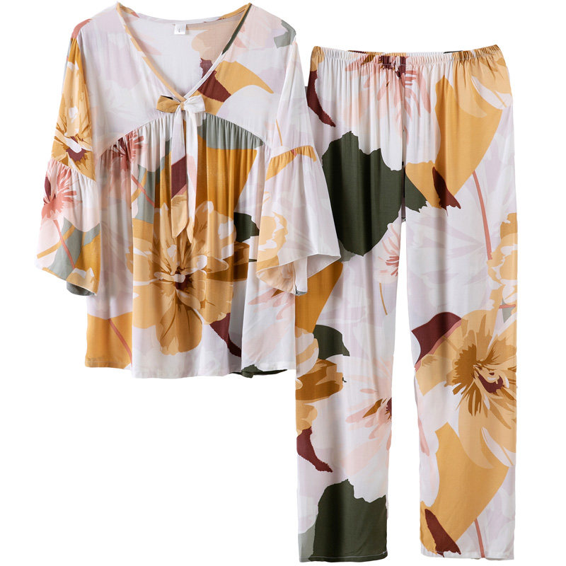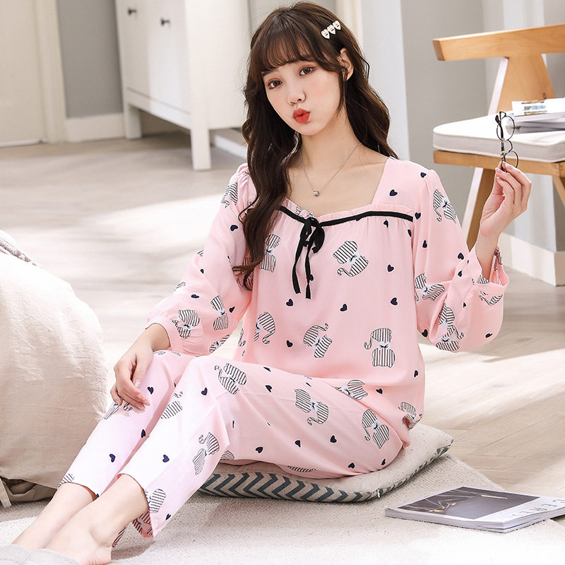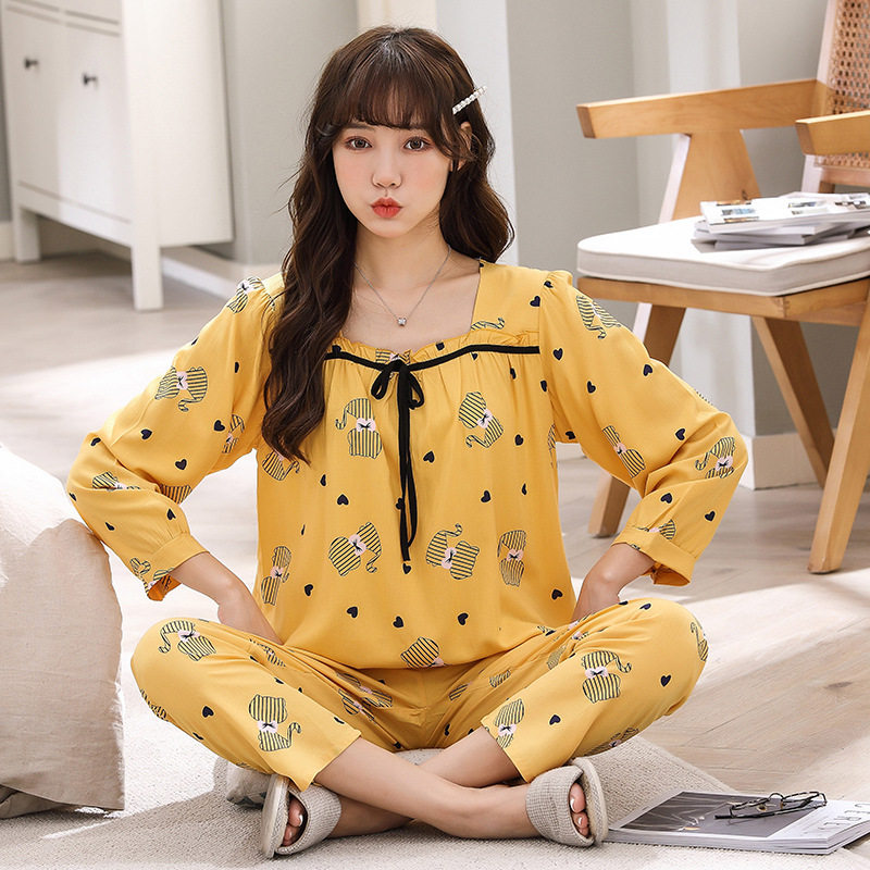 Spring Summer Cotton Silk Pyjamas Women's Home Dress Youth Long Sleeves Silk Oriental Silk Oriental Silk Mother Artificial Cotton Suit Loose Thin
