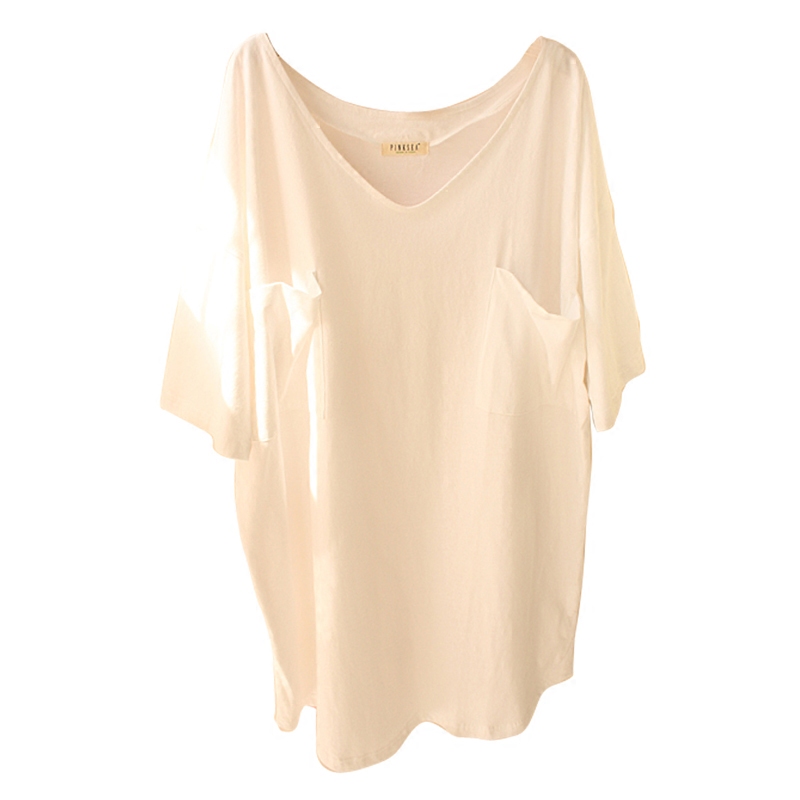 Long sleeve large pocket V collar white sleeping skirt T short sleeve large pocket V collar white sleeping skirt T