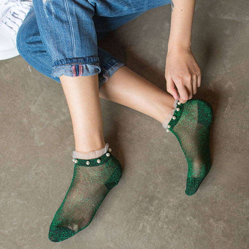 Lace Lace Invisible Socks Woman Spring Summer Season Thin South Korea Light Mouth Gold And Silver Bright Silk Pearl Socks Crystal Silk Short Socks Tide