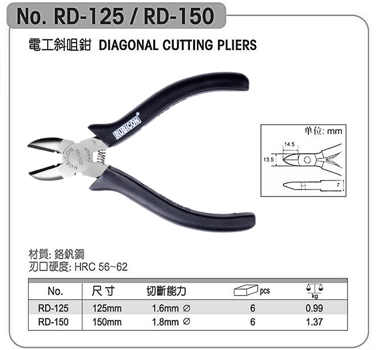 Japan imported RUBICON Robin Hood electrician oblique nose pliers RD-125 RD-150 oblique mouth pliers 6 inch oblique mouth pliers