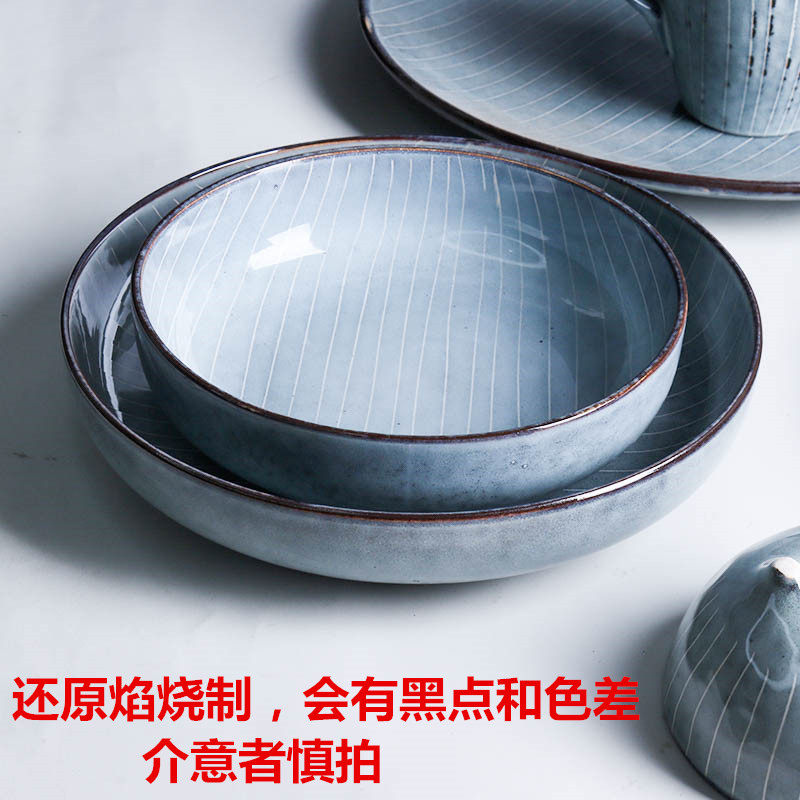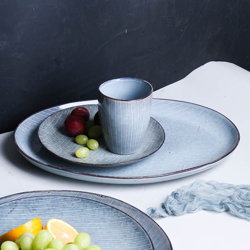Creative Japanese style 10-inch retro oval striped large plate Household 8-inch breakfast plate Western-style steak plate