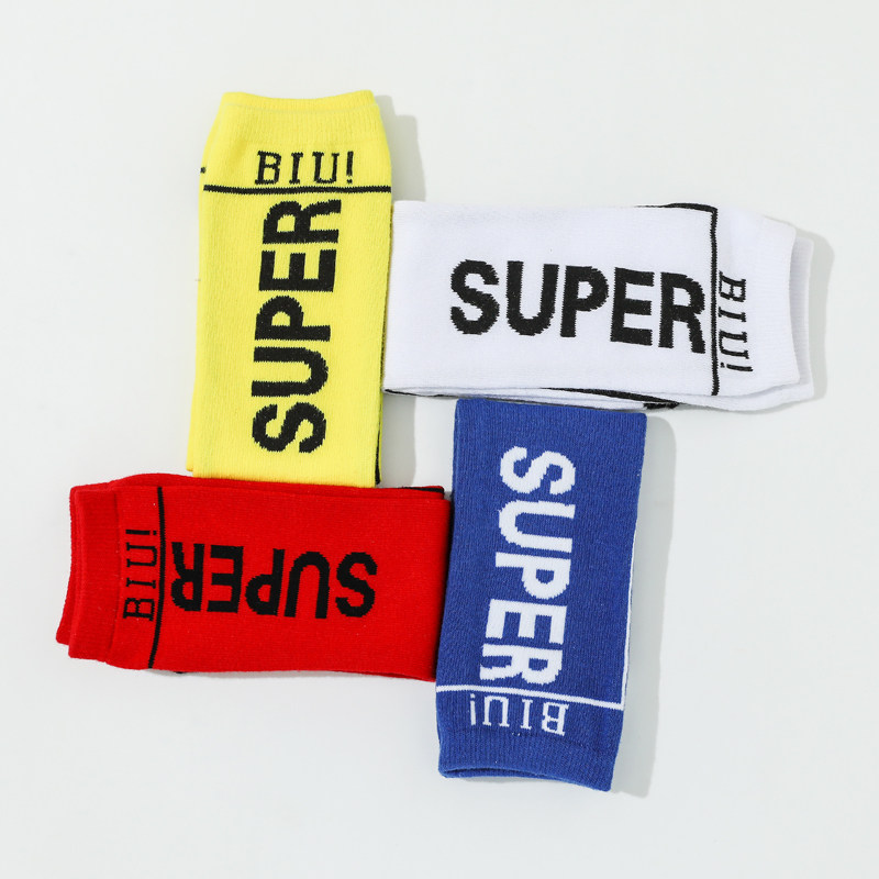 Red headband, red super socks, purple GOOD cap, blue super socks, white cap, white super socks, blue astronomy socks, black