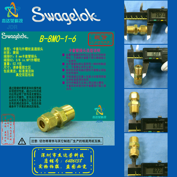 (B-8M0-1-6)Swagelok Brass Connections 8 mm Card Sleeve x 38 in NPT