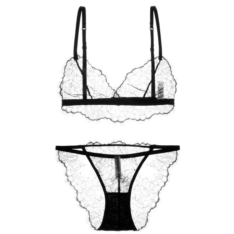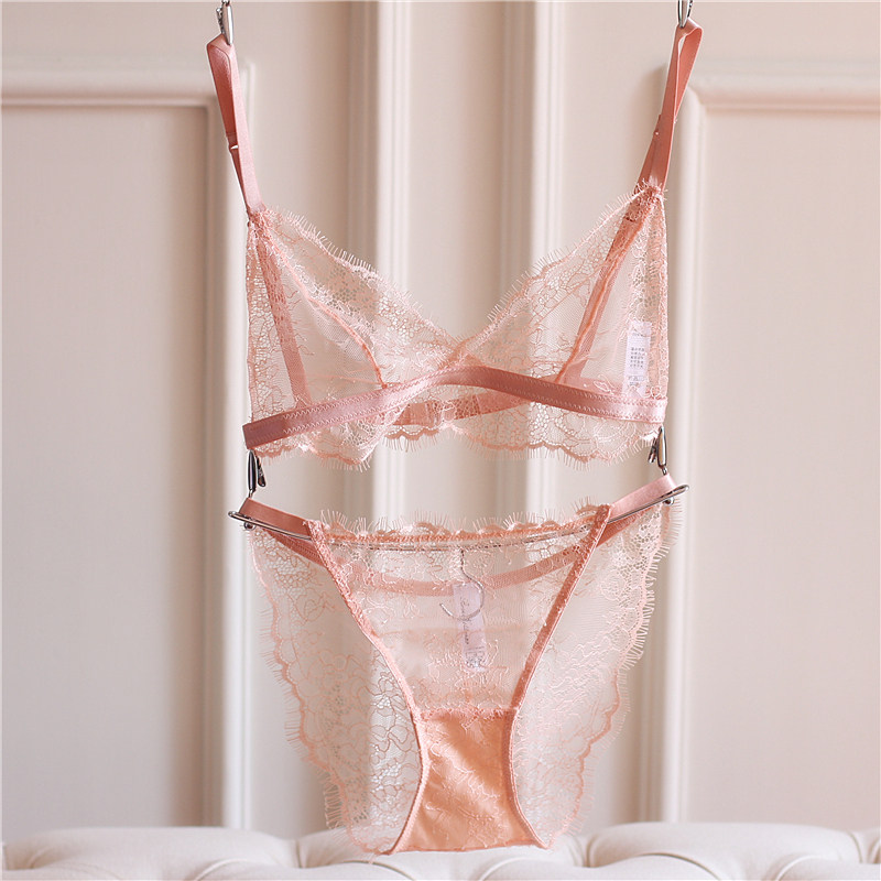 European and American girls underwear sexy ultra-thin lace transparent ring-free eyelash triangle cup underwear set spring and summer new