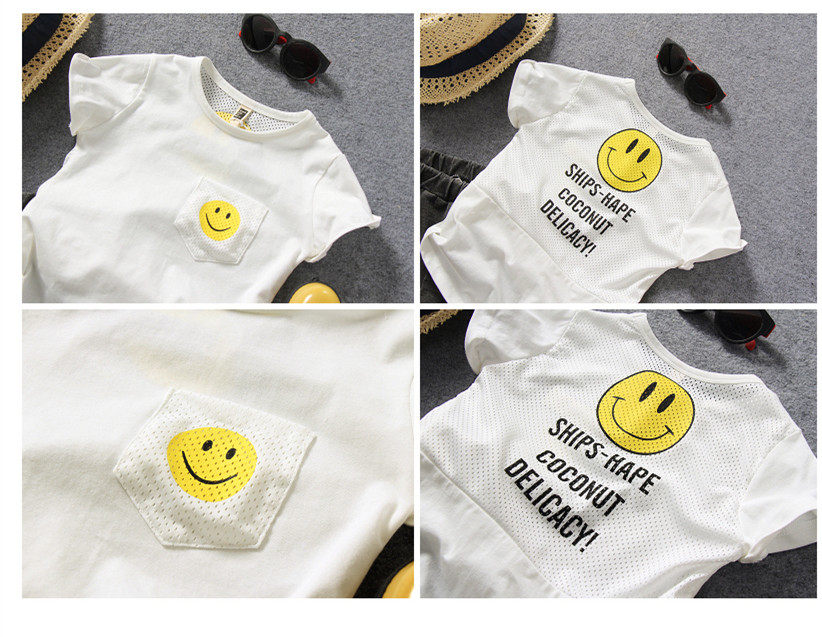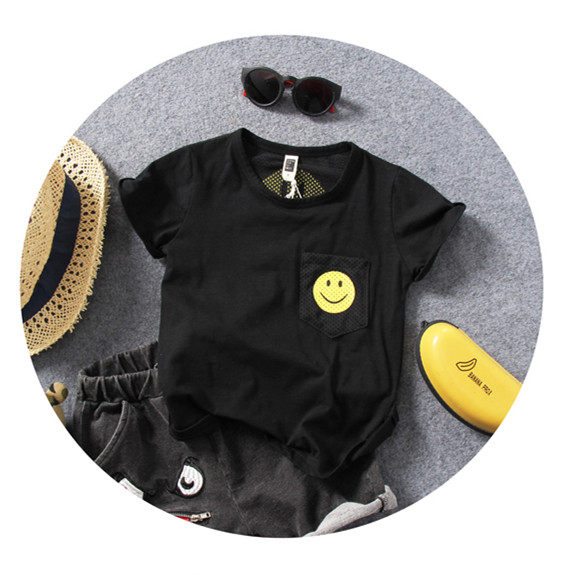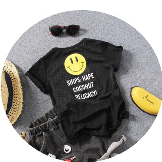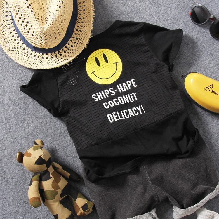 Children's Short - sleeved T - shirt Summer boy's smile printed net hollow splice cool half - sleeve T - shirt tide
