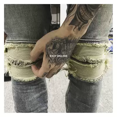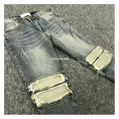 High Street KANYE Heavy Locomotive Splicing Patch Heavy Wash Yellow Slim Elastic Denim Pipe Pants Tide Men GD