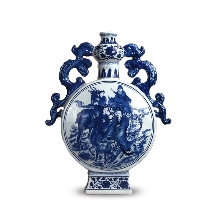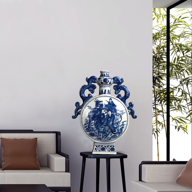 Jingdezhen ceramic binaural flat bottle Antique blue and white porcelain vase New Chinese modern living room ornaments home decorations
