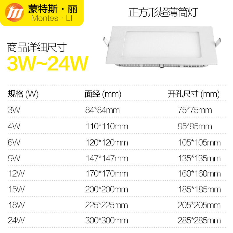 Square 3w Normal white opening 75x75mm square 3w neutral light opening 75x75mm square 3w warm yellow opening 75x75mm square 4w