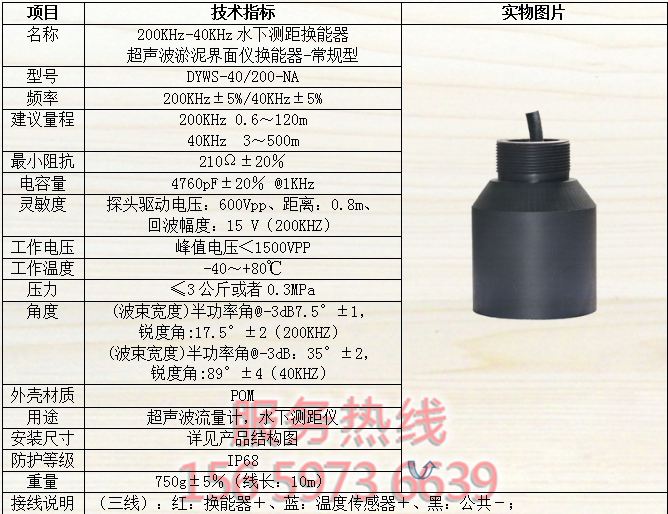 DYWS-40 - 200 - NA dual frequency ultrasound transducer underwater rangefinder