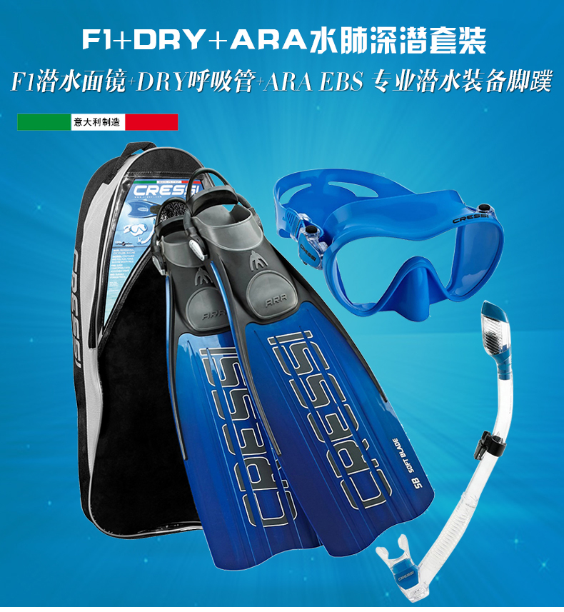 Italian CRESSI F1 professional diving mirror water lung deep diving long footbed equipped with snorkeling trippel