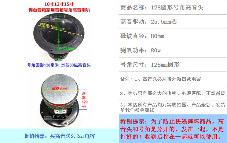 Professional stage speaker horn tweeter 25 core 80 magnetic 80w horn 128mm round