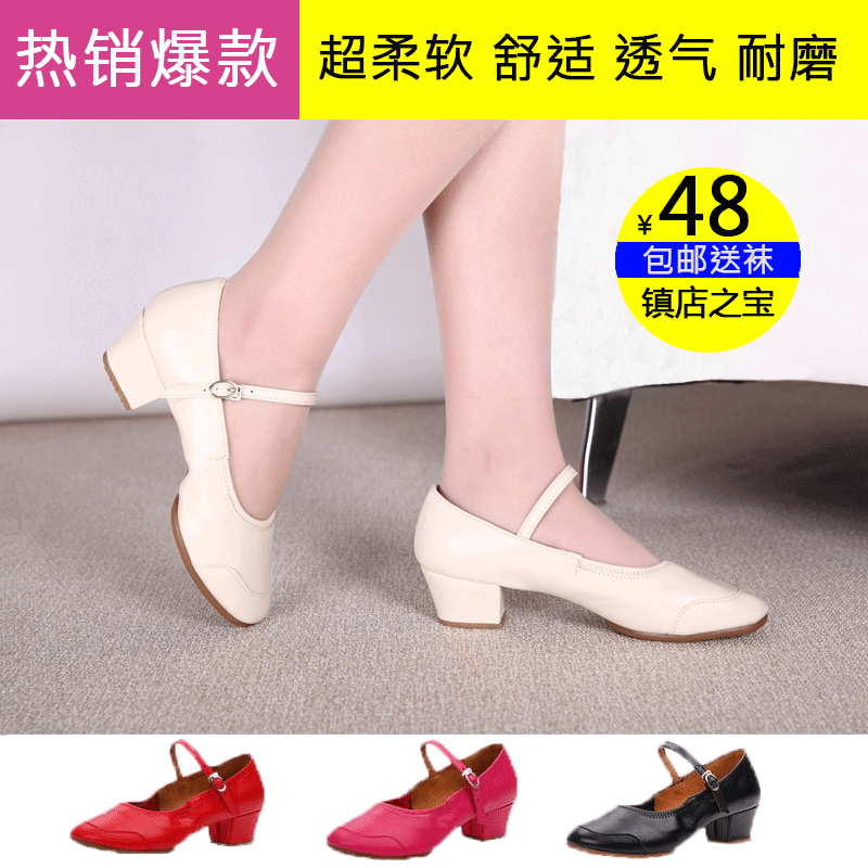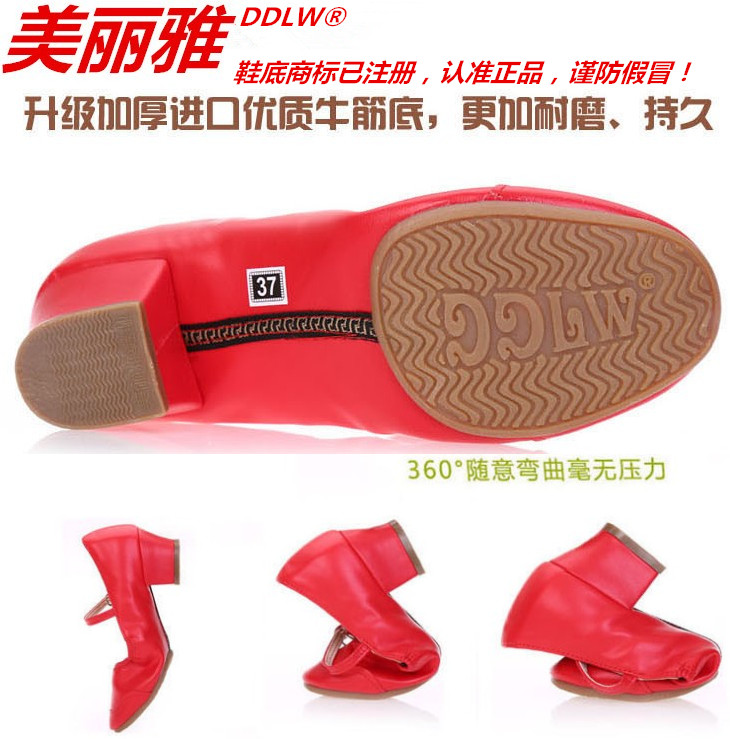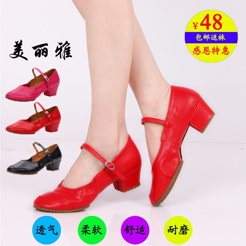 Meliya Spring and Autumn Red Square Dance Shoes Female Adult Soft Sole Leather Middle Heel Four Seasons Square Dance Shoes