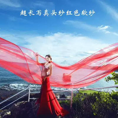 Location travel shooting red super long veil Bridal wedding photo Elegant red yarn sea view photo wedding photography photo props