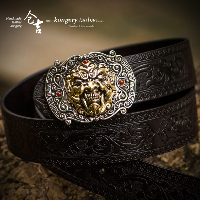 Kurayoshi handmade original snow lion belt printed men's casual first layer cowhide belt Genuine leather brass buckle