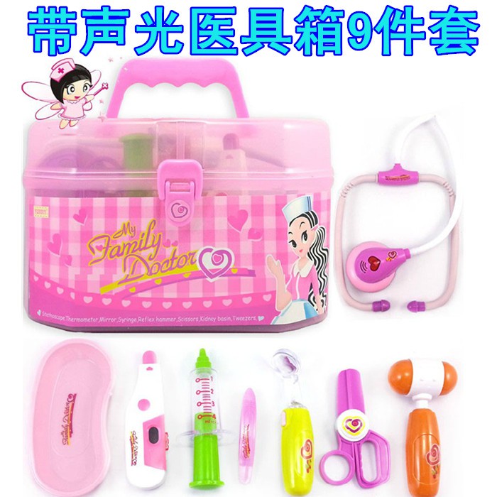 Doctor 30 pieces of medical kit 30 pieces of clothing doll hanging bottle rack powder Ribbon Sound and light Medical box 9 pieces Pink Audible and sound Medical clothes doll hanging bottle rack blue with sound and light Medical box 9 pieces of blue sound