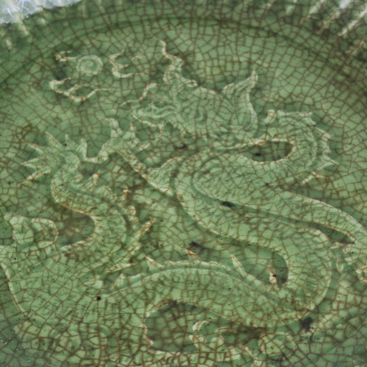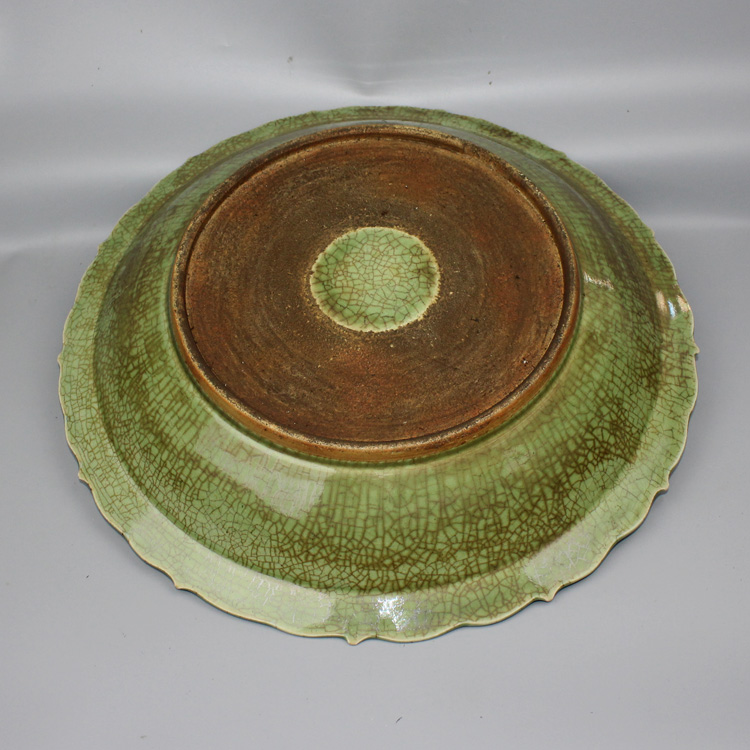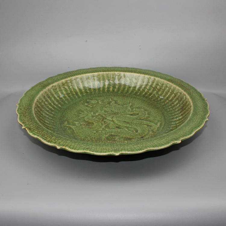 Qing Longquan kiln carved dragon pattern large plate flower mouth flint red background open antique antique collection fine ornaments ceramics