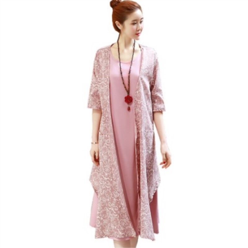 Cotton numb added to loose foreign dress Old-aged mom in two sets with long version of linen Holiday beach dress