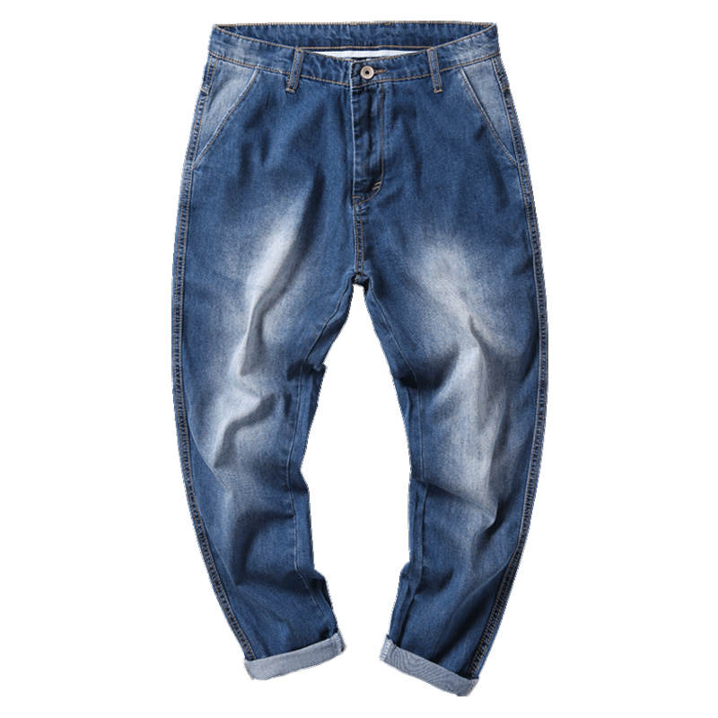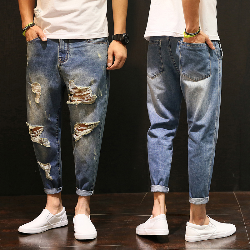 90% pants men's broken hole jeans loose Korean version trendy smoke pipe pants Fat son Harun 9 Pants Plus Fattening Overweight