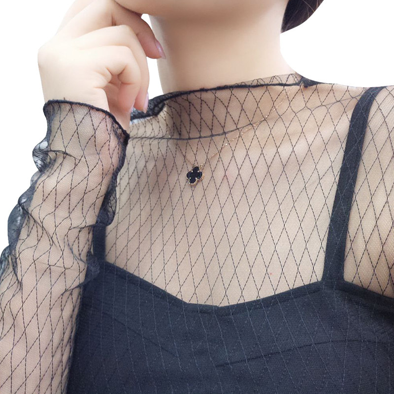 2022 mesh yarn transparent undershirt woman spring and summer new mesh internal lap sexy grid display slim lace blouses long sleeves