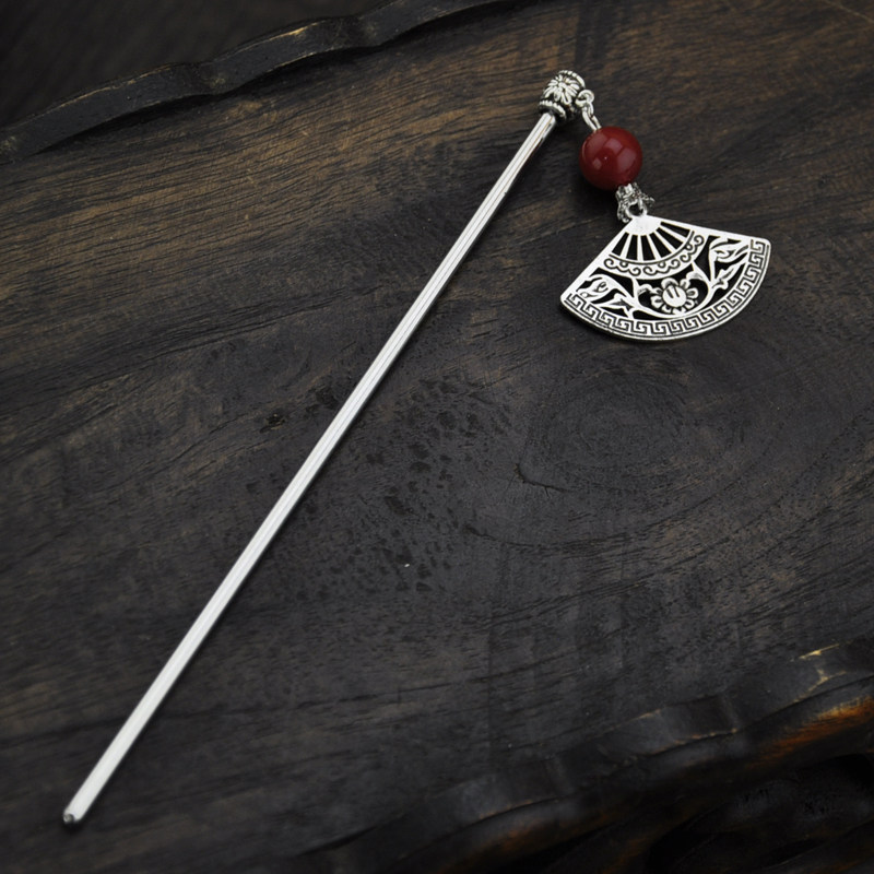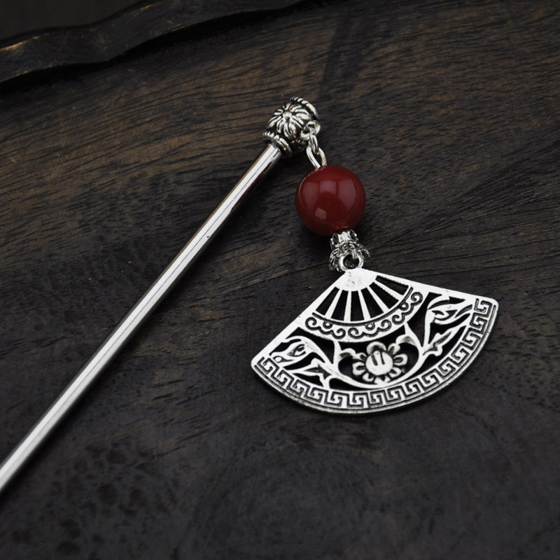 Retro hair accessories Miao Silver Hollow fan red agate classical hair hairpin step hair National Style Female gift
