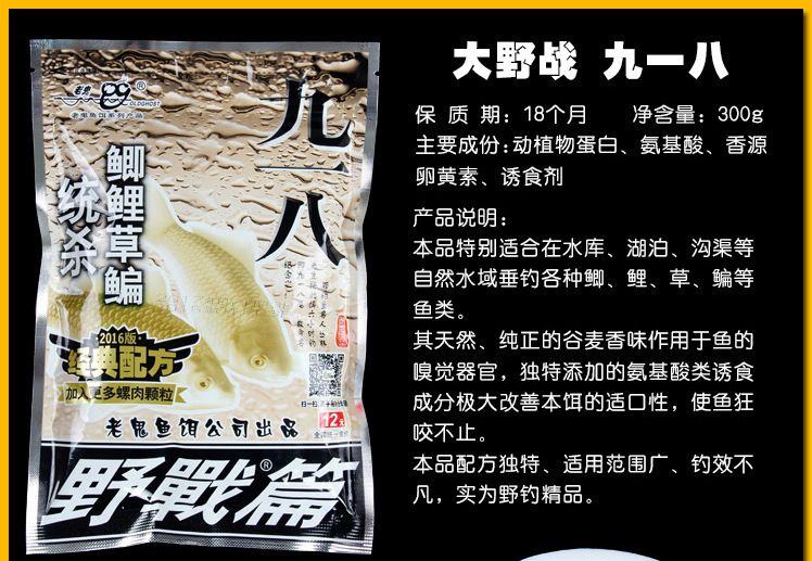 Nine One Eight 2# 100g Nine One Eight 2# Gold Edition 160g Nine One Eight Wine Fragrance 110g Big Field Fishy 300g Nine One Eight Small Field Fishy 100g Nine One Eight Bran Fragrance