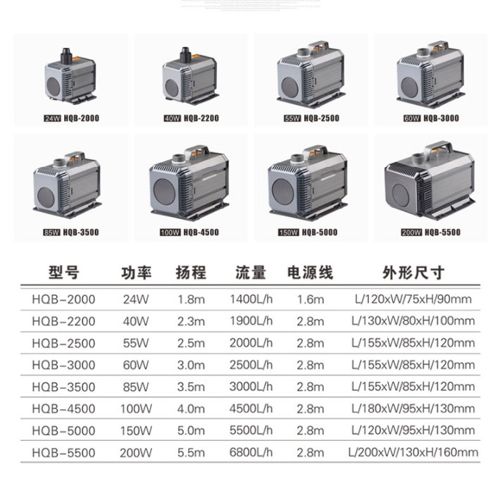 HQB-2000 24W send two meters water pipe HQB-2200 40W to send two meters water pipe HQB-2500 55W to send two meters water pipe HQB-3000